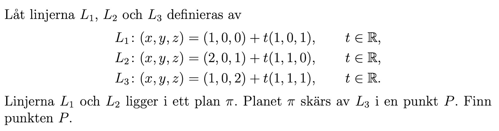 Eftersom L1 och L2 ligger i ett plan så tänker jag att dess riktningsvektorer: (1,0,1) och (1,1,0) är av intresse. Jag beräknade vektorprodukten för dessa och fick (-1,1,1) vilket är samma som normalvektorn för planet. Tänker då att planet pi kan skrivas som: -x + y + z + d = 0. Men, jag har alltså här ingen aning om vad får för värde, och för övrigt är det fel svar (planet pi ska enligt facit vara x - y - z - 1 = 0). Men hur man kommit fram till det förstår jag inte.