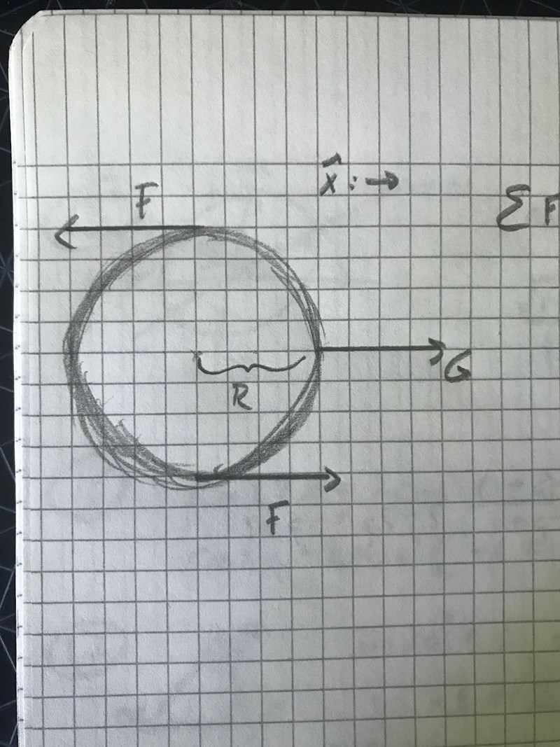 Jag tänker att kryssprodukten mellan G och vridarmen är noll ty , oavsett vart längs radien på hjulet man sätter angreppspunkten (då G och R är parallella), och om jag ställer upp kraftsumman för jämvikt, (där positiva riktningen är åt höger), då får jag att . Vad är detaljen jag missar i min fundering som gör att hjulet kan stå stilla om G är tillräckligt stor?