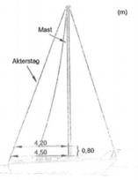 Avstånd från mastens fot och rakt ut mot akterstaget är det 4,5 meter. Från masten till akterstaget är det 0,8 meter högre upp och parallellt med första mätningen. Det avståndet är 4,20 meter