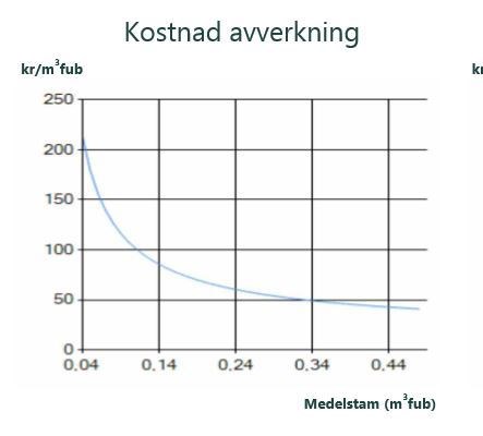 Om man vill veta vad den visar är det skogsavverkningskostnaden för en skördare som funktion av medelstammen på träden.