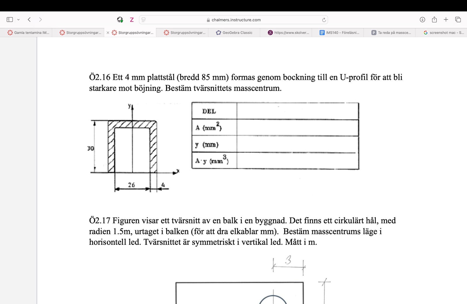 Uppgift: Ett 4mm plattsål (bredd 85 mm) formas genom bockning till en U profil för att bli starkare mot böjning. Bestäm tvärsnittets masscentrum.