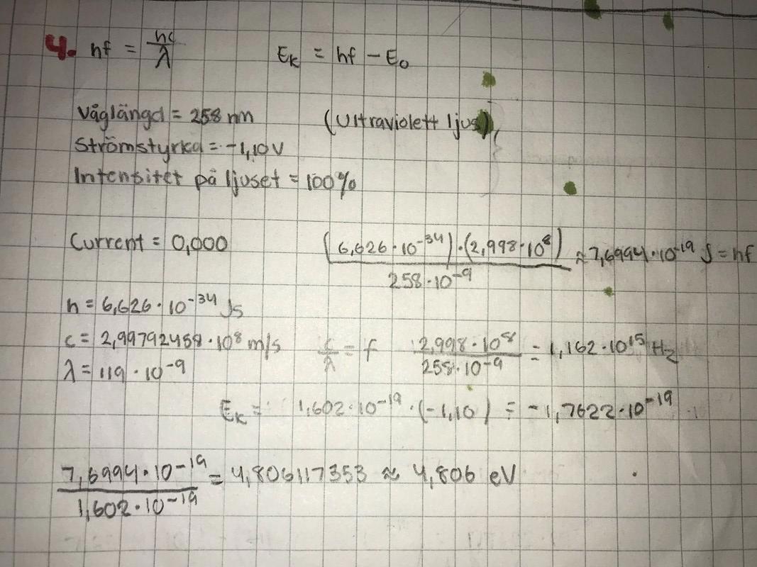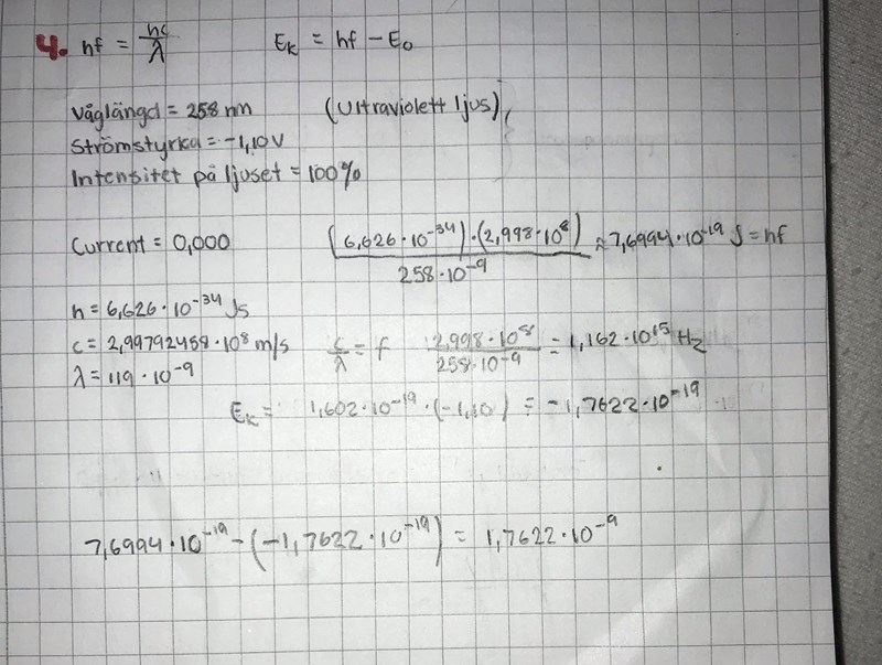 jag måste gjort misstaget då och skrivit strömstyrka istället för spänning, och våglängden var mitt misstag. jag hade andra siffror från början vilket gav mitt ett konstigt tal så valde nya men måste ha glömt bort att sudda ut 119·10-9