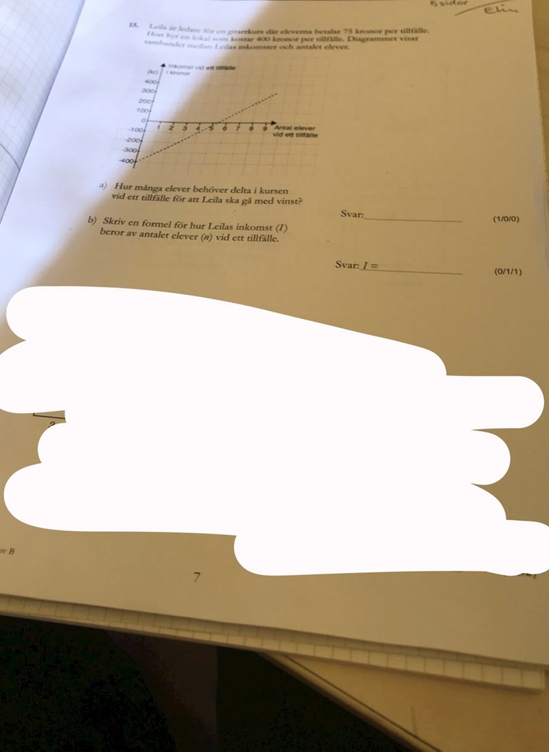 Hej! Jag skulle behöva lite snabb hjälp med en här frågan, tycker den var väldigt klurig, i texten står det: Leia är ledare för en gitarrkurs där eleverna betalar 75 kronor per tillfälle. Hon hyr en lokal som kostar 480 kronor per tillfälle. Diagrammet visar sambandet mellan Leias inkomster och antal elever.