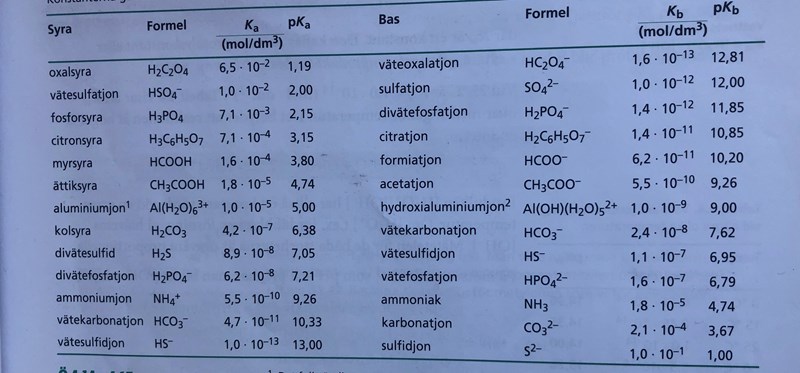 Okej tack, men som allmän regel kan man då tänka att: om allt som står i den kemiska beteckningen påverkar pH exempelvis HCOOH då kan man bara läsa av värdet rakt av. Men om det är något som ingår i värdet som inte påverkar pH-värdet (Ca2+ Na+ Li+ K+ Cl- NO3- SO42-) så måste man ta bort dessa från den kemiska beteckningen och därefter avläsa. Vart man sedan hittar dessa värden i tabellen avgör om det är Ka eller Kb vi ska ha. Om en kemiska beteckning skulle finnas i både spalten för Ka och Kb är det en amfolyt. Om det är en stark syra/stark bas kommer den protolyserars fullständigt och då är inte ka eller Kb definierat då nämnaren blir noll och då saknas pKa eller pKb värde.