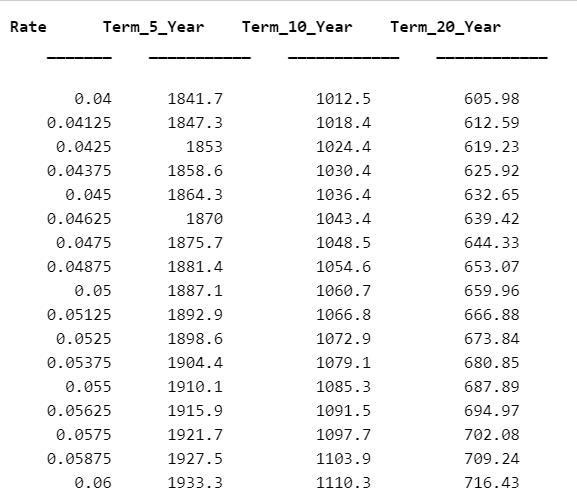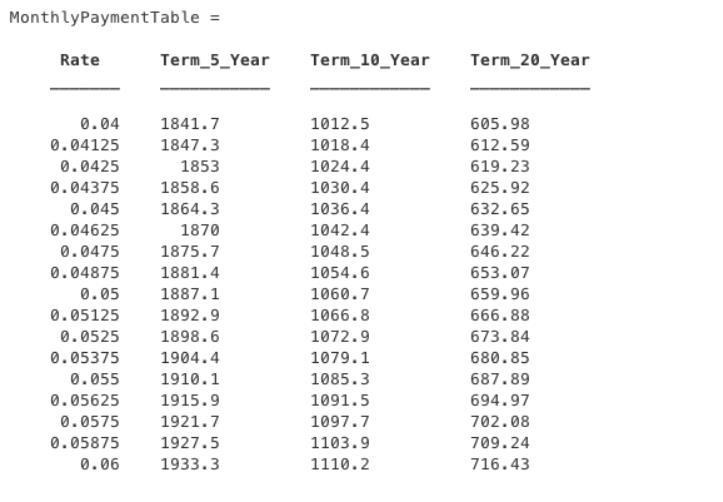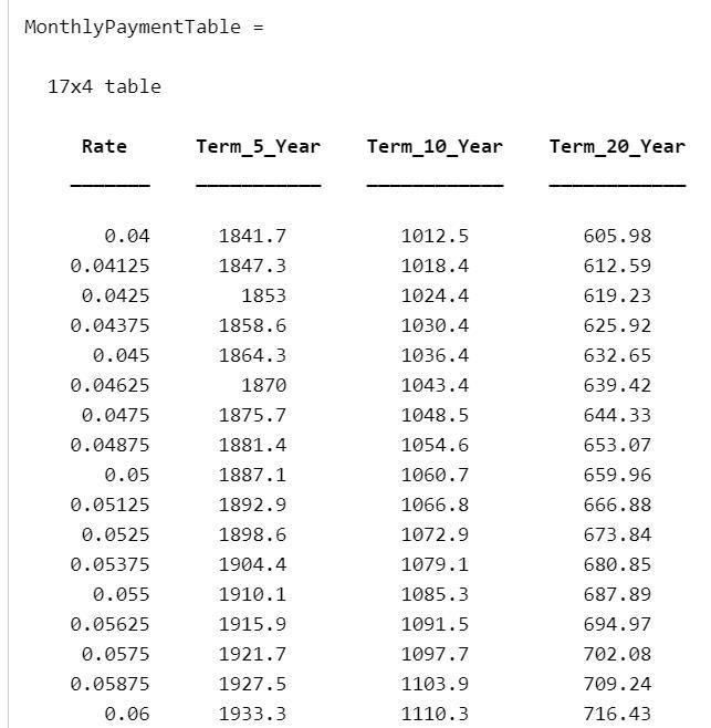 MonthlyPaymentTable=table(Rate,Term_5_Year)