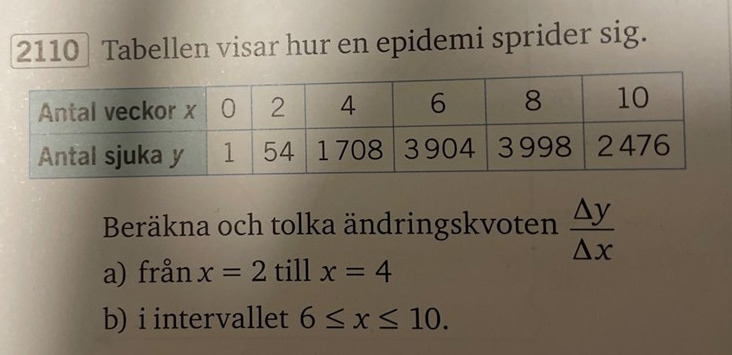 Smaragdalena skrev:Mysticmac skrev: jag duck delta y till 3904-2476 Och Delta x till 6-10 och delar de så jag får ut = 357 svaret blir dock 360 personer i veckanBehöver hjälp med uppgift b då jag får det till delta y delta x som jag förstår det blir y1 2476 och y2 3904 samt x1 10 och x2 6 men får fram fel svar när jag ska räkna ut k värdet, hoppas någon kan hjälp mig och ber om ursäkt om jag är otydlig
