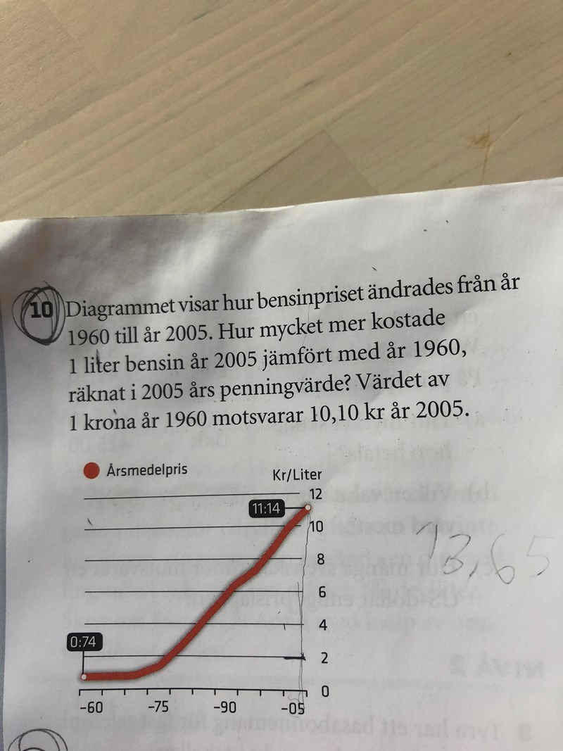 Du vet att 1 kr år 1960 motsvarar 10,10 kr år 2005. Hur mycket motsvarar 0,74 kr (literpriset för bensin) år 1960 i 2005 års penningvärde?