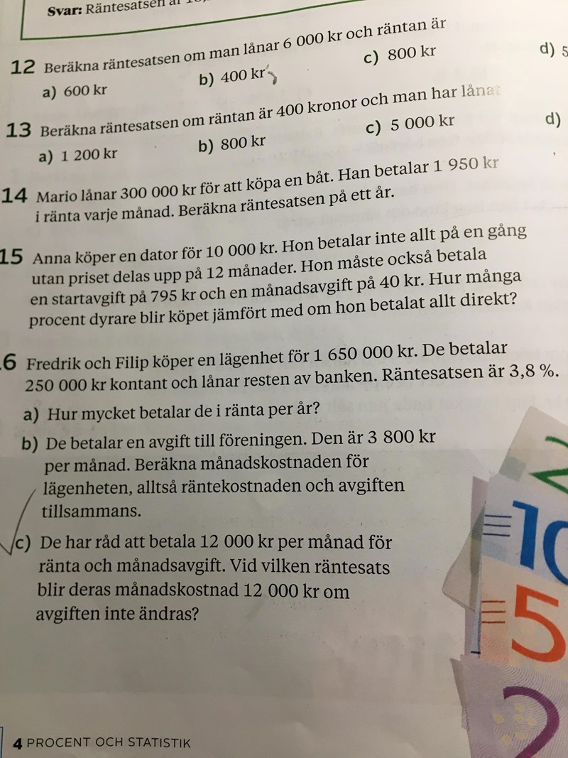 Det verkar om du inte har tolkat frågan rätt. Det är om räntesatsen är 3,8 % so månadskostnaden är 8 323 kr/mån, men räntor kan ju höjas. De har råd att betala 12 000 kr i månaden för avgift + ränta, och avgiften är 3 800 kr/mån. Det innebär att de har råd att betala max 8 200 kr/mån i ränta. Vilken räntesats är den högsta de har råd med? Vilken ekvation skall du använda för att kunna beräkna detta?