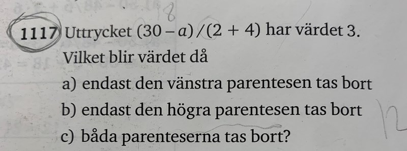 men jag fattar inte vad dom menar med när dom säger ta bort endast vänstra eller högra parentesen, menar dom att det ska vara : 30-a/ (2+4)??