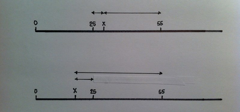 Du kan rita upp en tallinje, markera 25 och 55 och passa in x så att det stämmer. Eller ställa upp en ekvation för det (55 - x = ...).