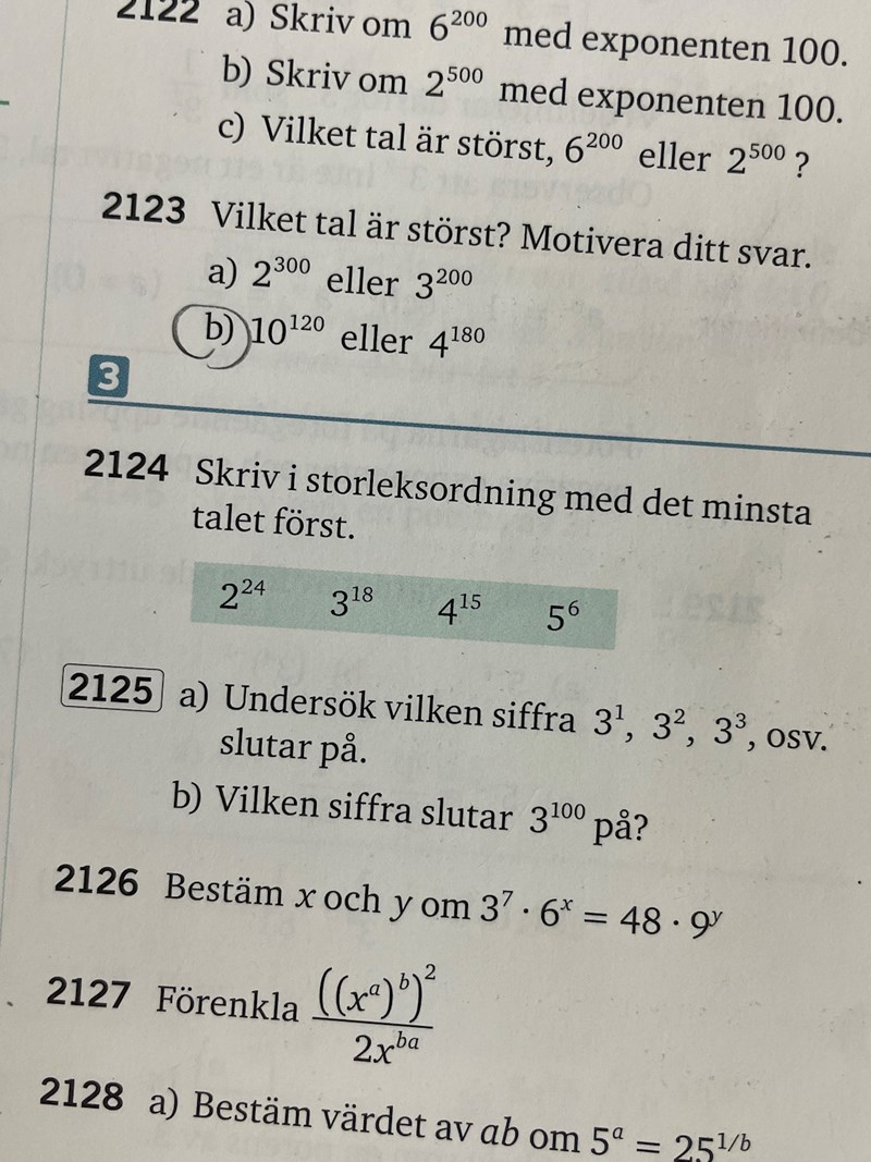 Man får försöka manipulera talen till den graden att man är säker på att jämföra dem med varandra. Man behöver inte förkorta dem maximalt (så som jag gör) men kan vara bra att se hur man kan göra. Den stora frågan är hur man ska kunna jämföra dem med varandra, och det är enklast att se till antingen exponenten eller till basen. Gör man följande omskrivningar: