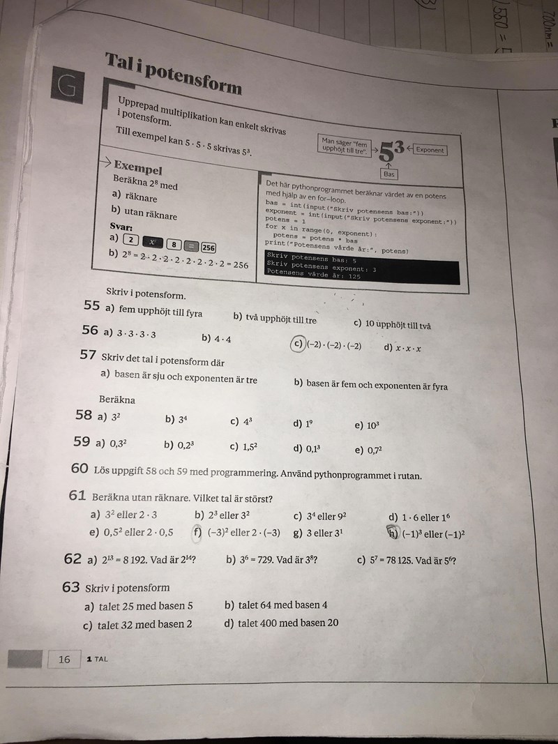 Hej jag förstår inte på exempel rutan det står beräkna 2^8 b) utan räknare = är det inte 2 x 8 = 16??? Eller 32? Förstår inte hur de blir 256?Nej, det är inte 2x8=16 är inte samma sak som att skriva när man "höjer upp" eller ger en siffra en exponent som det heter så betyder det att man anger hur många gånger ett tal ska multipliceras med sig själv. Såhär: (8st tvåor)