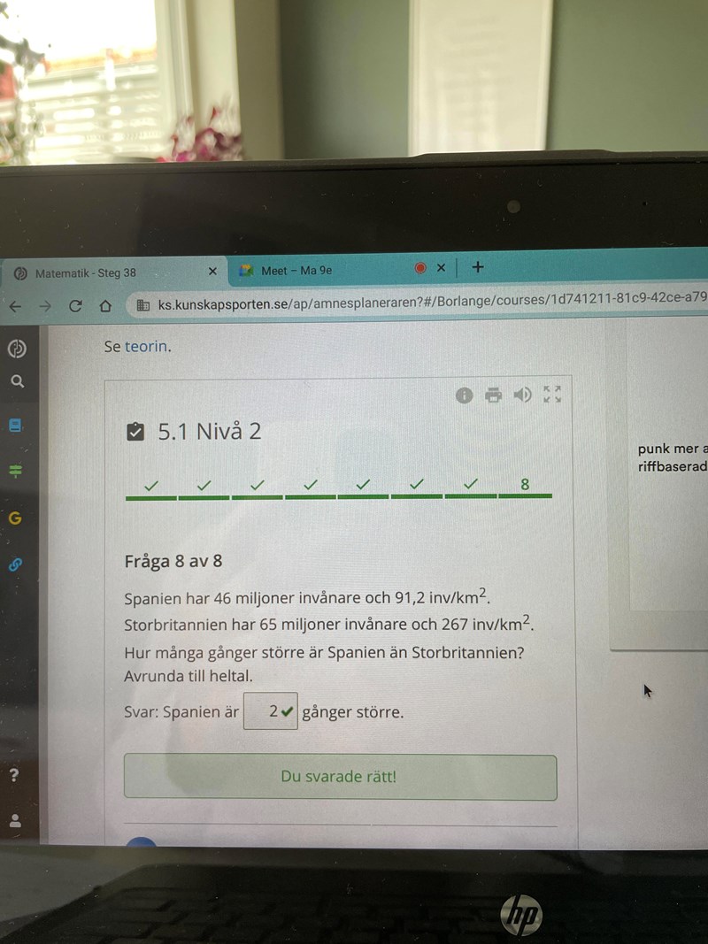 Spanien har 64 miljoner invånare och för varje 91.2 invånare finns det 1land. Det ger en yta på 64 000000 / 91.2