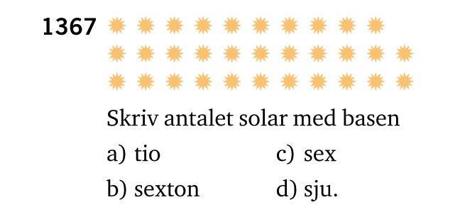 Hejsan, jag vet redan ungefärligt hur man räknar med talbaser. Frågan jag däremot undrar är vad man utgår ifrån när talet enligt bilden inte nämner vilken talbas solarna har från början. Är endast 32 solar jag ska omvandla till olika talbaser. Hjälp hade uppskattats!