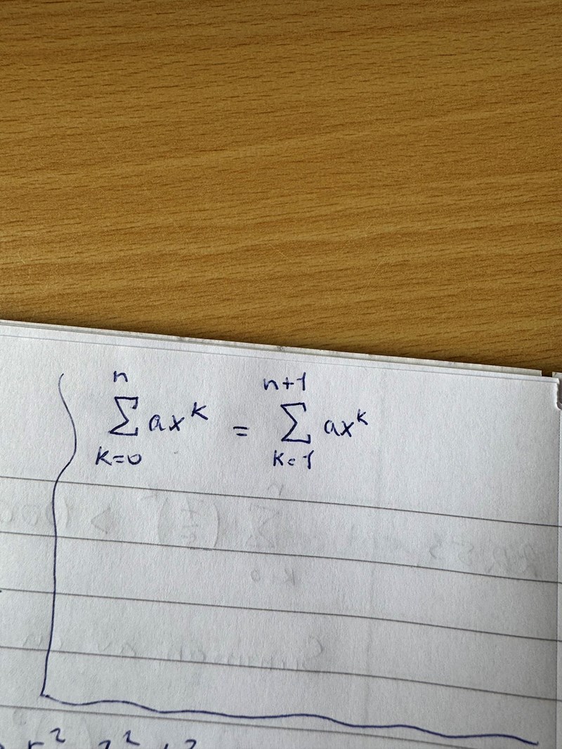 Infogat en lösning jag hittade på internet då min var kladdig, men jag menar på uppgifter likt den ovan. Där det är ett summa tecken och att det rör sig om tal mellan k=0 till n. Min fråga är då varför man sätter in n+1, är det så för att talföljden början på noll och att man måste ta med det 0:te elementet i summan?