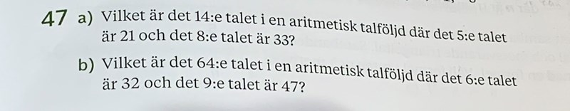Arminhashmati skrev:Jag tänker mig att det enkla är att ställa upp en generell formel för den aritmetiska talföljden i b) uppgiften, vet du hur man går det?