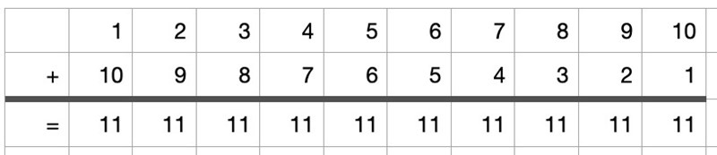 Nu ser vi att varje kolumns summa är 11. Lägger man ihop alla kolumnsummor blir det 10*11=110.