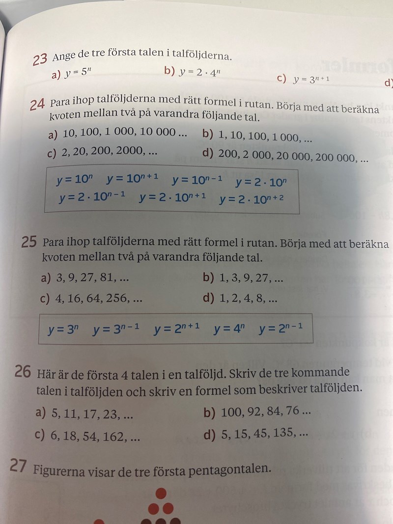 Hej, kan någon förklara hur man kan skriva en formler till dessa geometriska talföljder (uppgift 24), det vill säga hur man ska tänka.