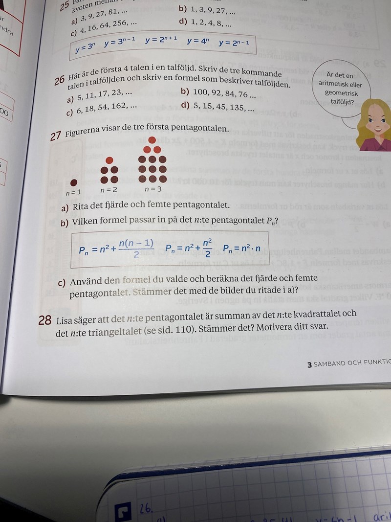 Hej jag behöver hjälp med fråga 27. Jag har testat med att kolla om det är en aritmetisk talföljd, men det var den inte. Jag har även kollat om det är en geometrisk talföljd, men det är inte heller det. Jag förstår inte hur jag ska göra.