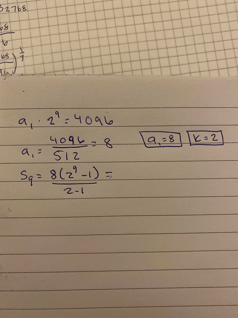Vi (åtminstone jag) vet att 1+2+4+...+2n = 2n+1-1. Alltså är summan av alla två-potenser från 1 till 2048 = 4096-1 = 4095. 1+2+4 = 7, så vår önskade summa är 4095-7 = 4088. Facit är fel, du har rätt.