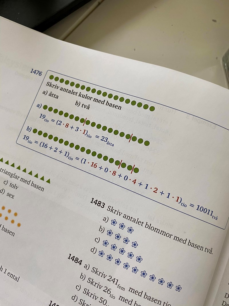 Jag förstår så långt som till när man kommer till resultatet. Jag får inte ihop hur 1x16 + 0x8 + 0x4 + 1x2 + 1x1 ska bli 10011. Hur ska jag tänka?