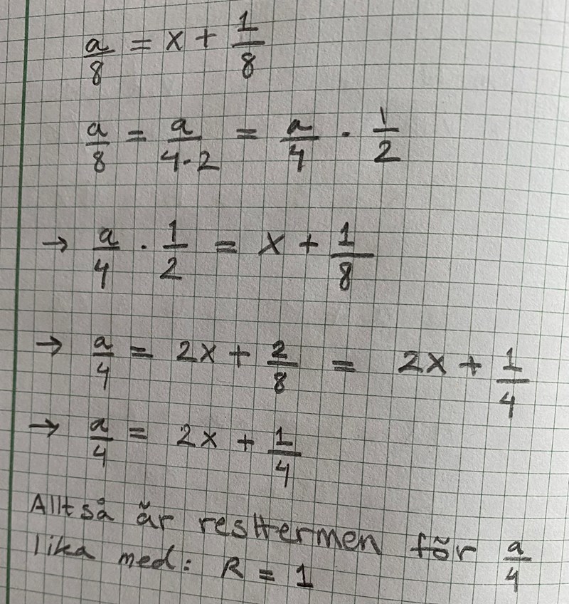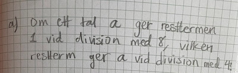 Hej! Jag håller på med en matte uppgift som handlar om delbarhet och resttermer. Min uppgift är att ta fram resttermen för a dividerat med 4 baserat på resttermen a har vid division med 8.