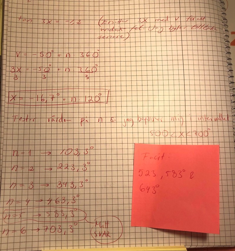 Jag får inte mitt svar att stämma med facit, kan någon anmärka felet i mina uträkningar? Jag fick i alla fall rätt på en av de vinklarna.