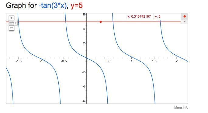 Den här uppgiften har ju olika svar beroende på om man pratar om grader eller radianer, dessutom ser du inte på grafen att tan() har oändliga värden, så om du bara zoomar in så hittar du en skärning eller hurmångasomhelst.
