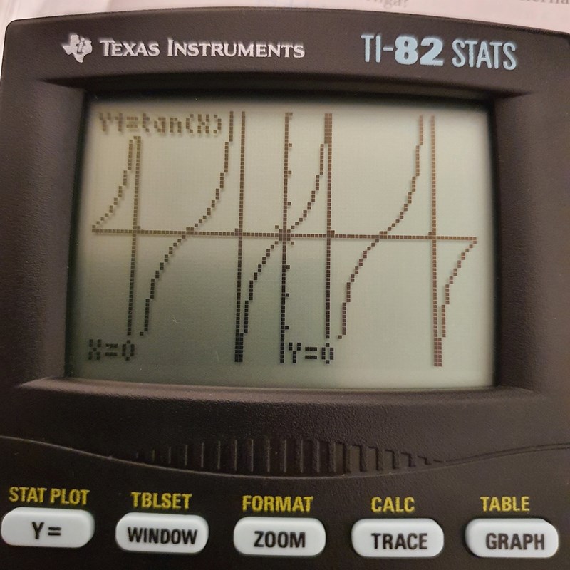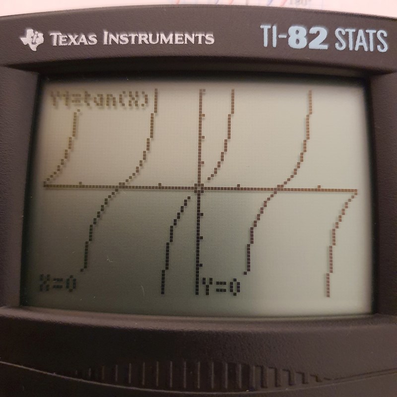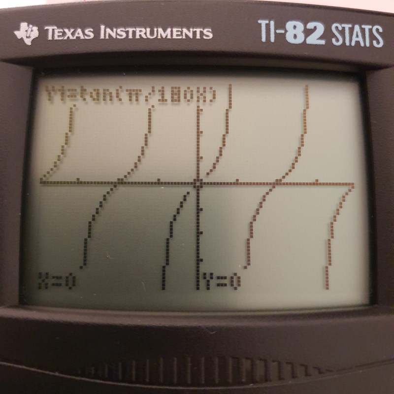 Hej! Varför ser tan(x) ut så här? Räknaren är inställd på radianer, men om man ställer om till grader ser det normalt ut.