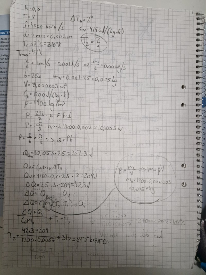 Normal tandtemperatur är 37 °C. Då temperaturen i tanden når 47 °C upplever patienten smärta. Antag att vattenflödet i borren är 1 ml/s och att vattnets temperatur stiger 2 °C när det passerar över tanden.