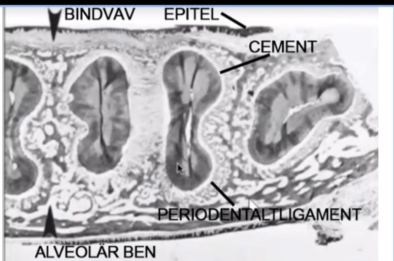 Vi ser inte riktigt ovansidan på tanden/eller kronan i tvärsnittet, så tänderna i bilden kan vara erupterade, men tvärsnittet finns djupare närmare nerven. Och cementen brukar ligga närmare roten, från gingiva motsvarande tandens rot. Kronan är täkt av emalj, men vi ser inte riktigt någon krona.
