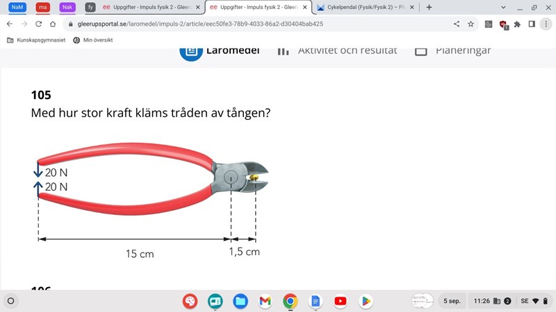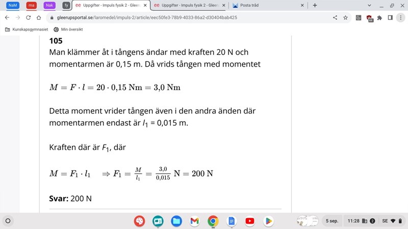 kan man tänka att trådens tyngdpunkt vrider stången medurs och medurs=moturs och i andra sidan så är det kraften 20 N nedåt som vrider tången moturs, och att det är just därför vi räknar med 20 N bara?