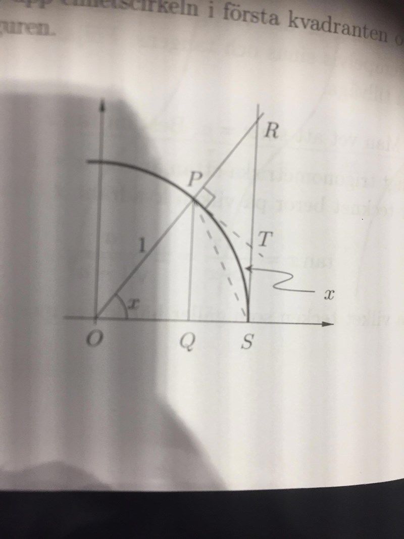 De två trianglarna OQP och OSR är likformiga. Det medför att kvoten sinxcosx\frac{\sin x}{\cos x} för triangeln OQP är lika med kvoten |SR|1\frac{|SR|}{1} för triangeln OSR.