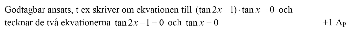 Sedan kan man bryta ut tan(x) och anv. nollproduktsmetoden för att få två lösningar. Det finns andra metoder också men detta är den mest "strömlinjeformade" av alla metoder och det är bra att bli van vid en metod som säkert fungerar.