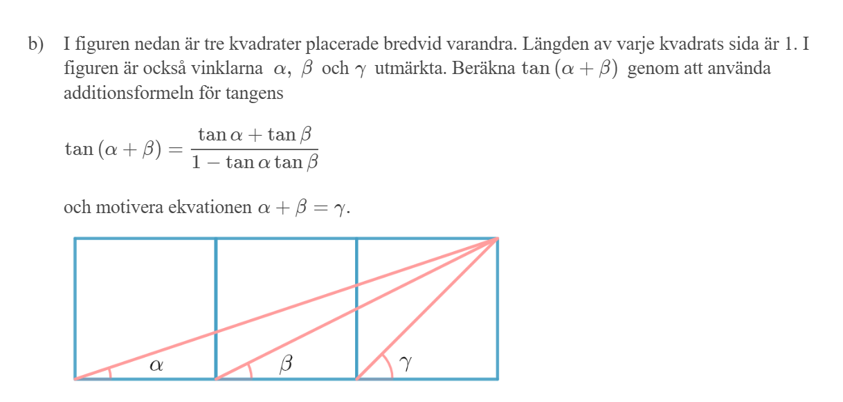 Hej, i denna uppgift har jag tagit reda på tan alfa = 1/3 och tan beta = 1/2. Jag satte in i formeln och fick ut svaret 1. Men hur kan jag motivera att alfa + beta = y mer än att sätta in arctan 1/3 +arctan 1/2 = arctan 1?