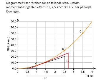 Din röda linje ser inte ut att gå genom punkt A alls. Då är den inte en tangent till den gula kurvan i punkten A. Det ser istället ut som om den röda linjen tangerar kurvan ungefär vid t = 1.3 sekunder.