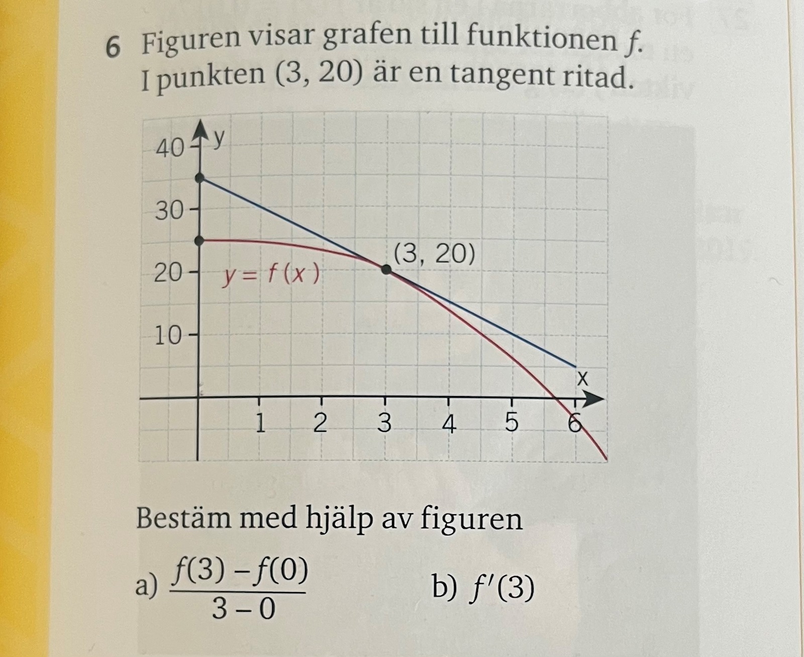 Okej tack, trodde det var röda linjen jag skulle ta reda på. Tog punkten (1, 30), fick 20-30 / 3-1 = -5. Så f’(3) borde vara -5.