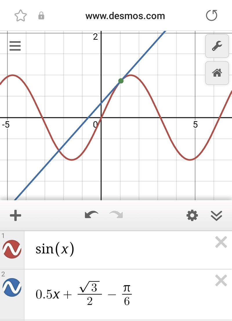 Vad är det för sorts ekvation vi pratar om. Så vi anger sinusvärdet och radianvärdet i ekvationen för linjen till det sinusvärdet? Läser man det här rakt av och subtraherar π/6 ifrån √3/2 så blir ju det här helt fel, eller.