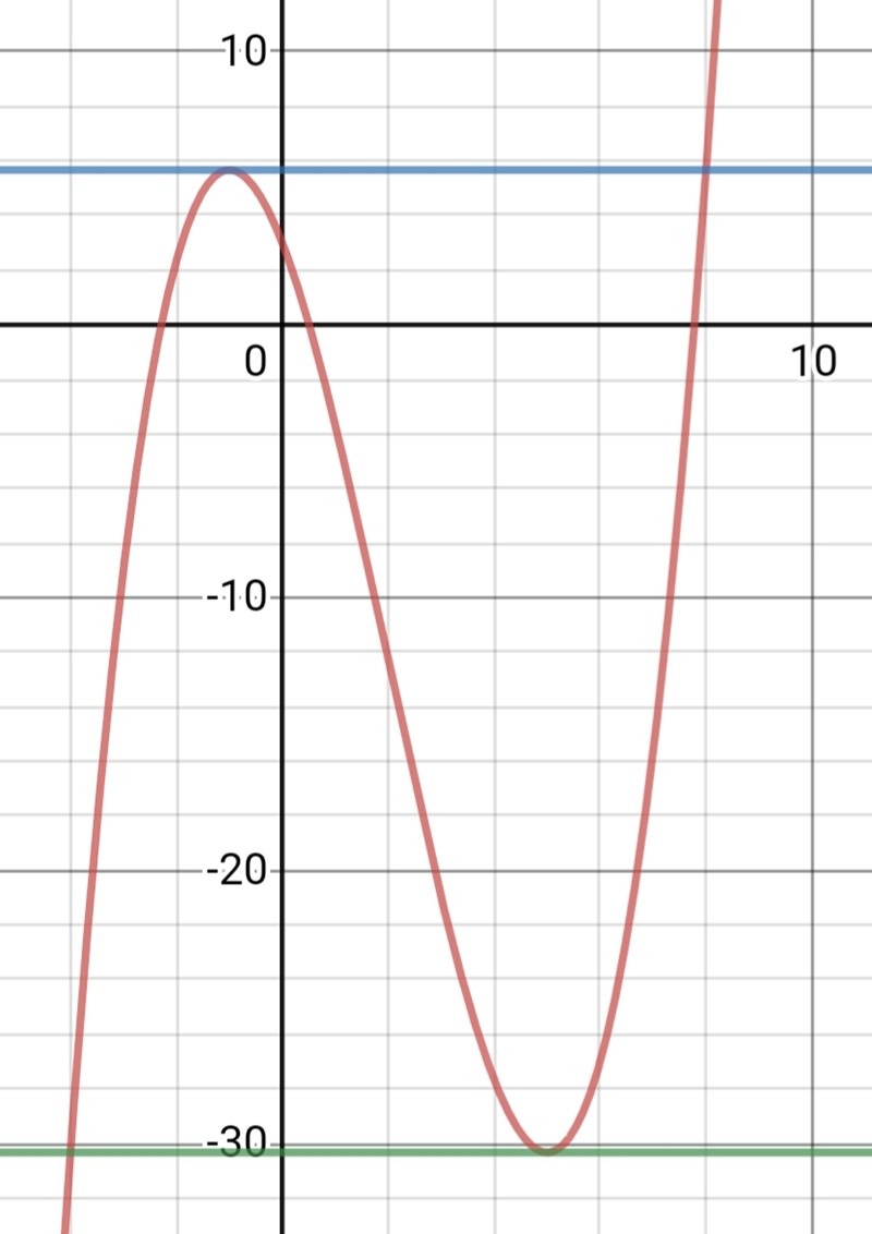 Jag ville bara visa en bild där det tydligt syns att grafen har två horisontella tangenter och att grafens placering i -led beror på värdet av .