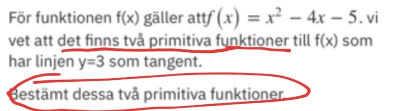 ”det finns två primitiva funktioner till f(x) som har linjen y=3 som tangent”.