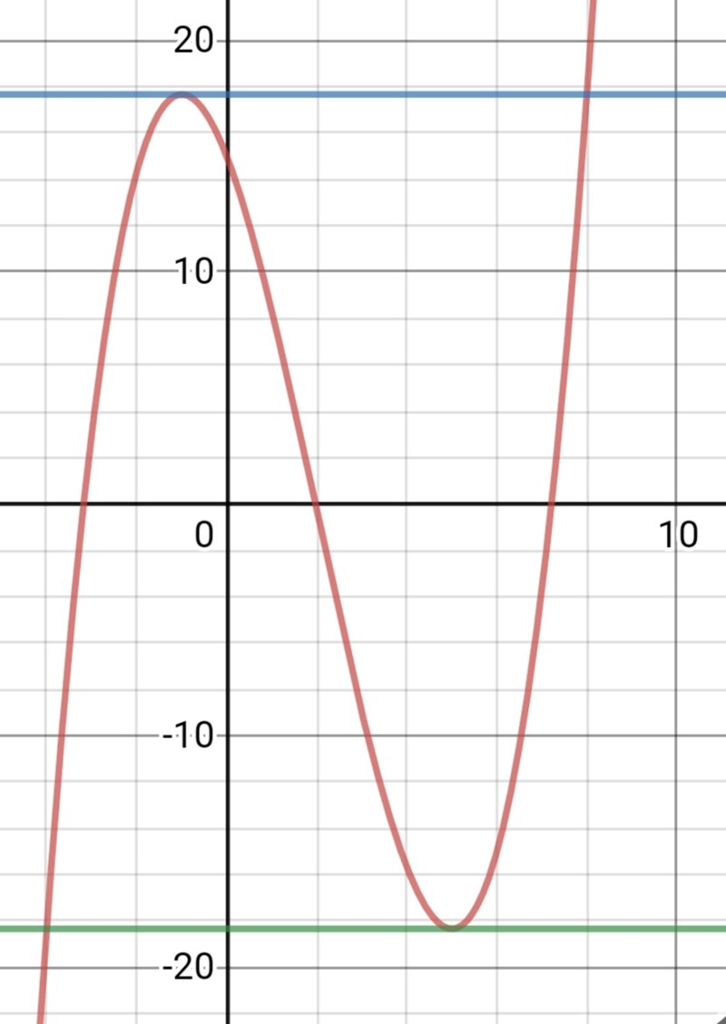 Jag har även ritat ut de två horisontella tangenterna. Den blåa tangenten har tangeringspunkt vid . Den gröna tangenten har tangeringspunkt vid .