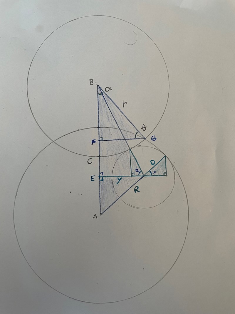 Så sträcka sqrt((R-D)^2 -y^2))+ sqrt((r+D)^2 - y^2))= AB. Sedan lösa ut Y härifrån.
