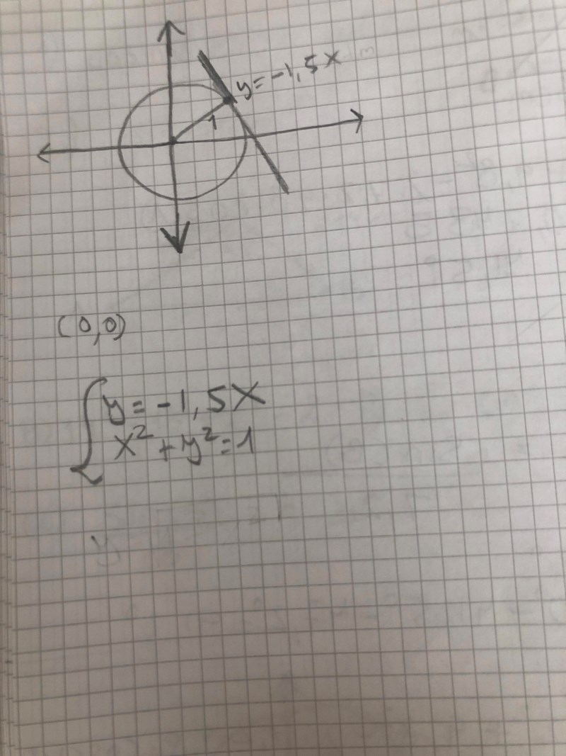 Jag har en uppgift som lyder: Tangeten till punkten P på enhetscirkeln har lutningen -1,5. Bestäm koordinaterna för punkten P om man vet att punkten ligger i första kvadranten.