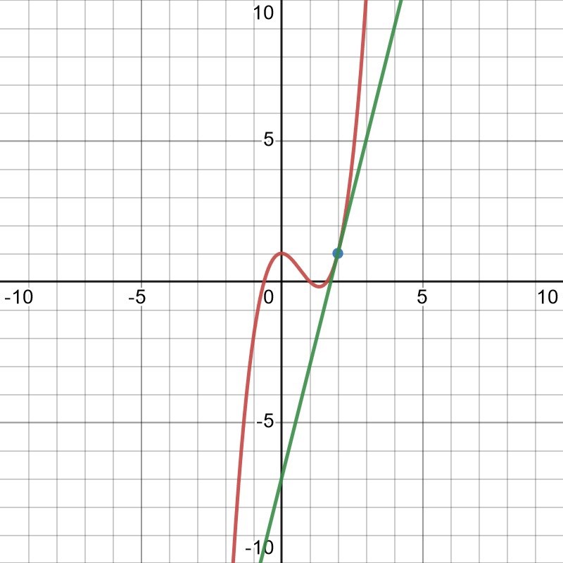 Uppgiften lyder: ) Kurvan: 𝑦 = 𝑥^3 − 2𝑥^2 + 1 har en tangent i punkten (2; 1). Bestäm tangentens ekvation.