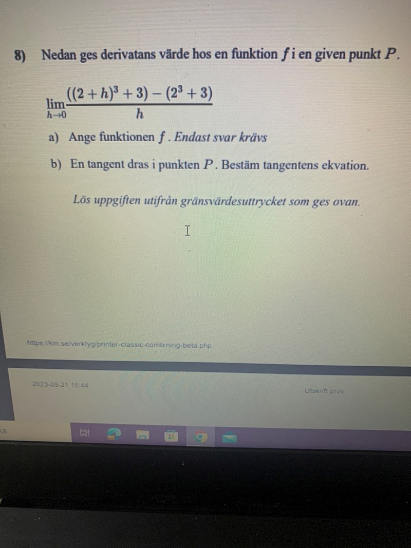 oj förlåt jag är lite trött idag. y’ blir 3x^2. Om man sätter in tvåa så får man 12. Det jag inte förstår är vad 12 står för. Är det k-värdet eller är det y-värdet? Är det inte så att derivata är tangentens lutning. Borde inte 12 vara k-värdet