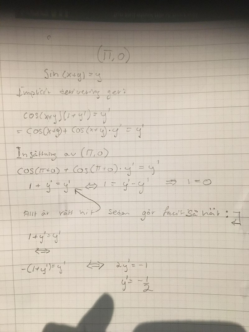 Tangentens ekvation bestäm. Sin(x+y)=y i punkten (pi,0)
