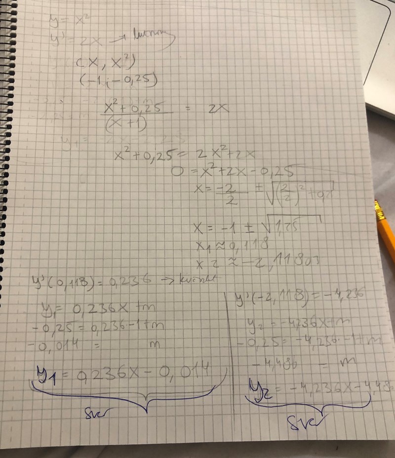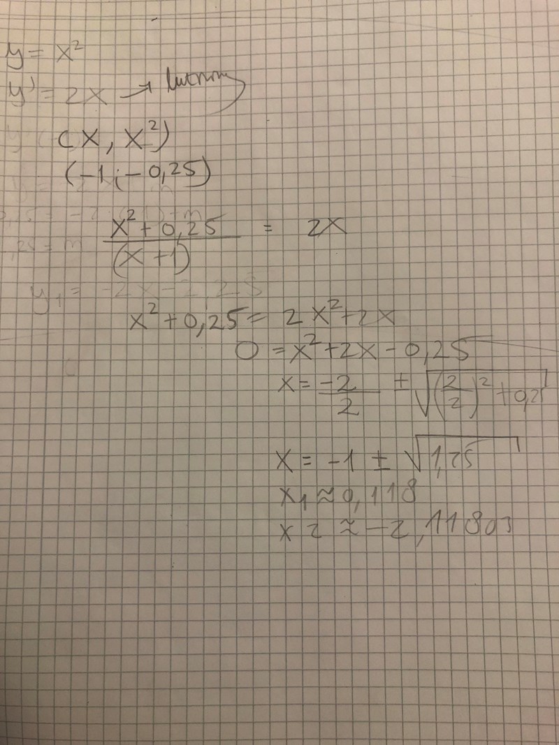 Visa att tangenterna till kurvan y=x^2 som går genom punkten (-1, -(1/4)) bildar rät vinkel mot varandra.