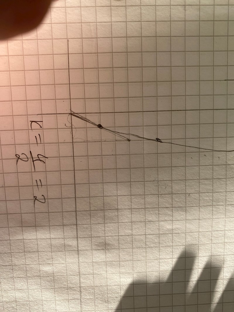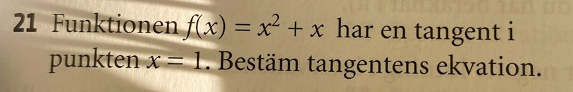 Börja med att rita en bättre bild. Sedan: Använd dig av derivata för att ta reda på lutningen. Sätt in x, y och k i räta linjens ekvation y = kx+m och beräkna m.