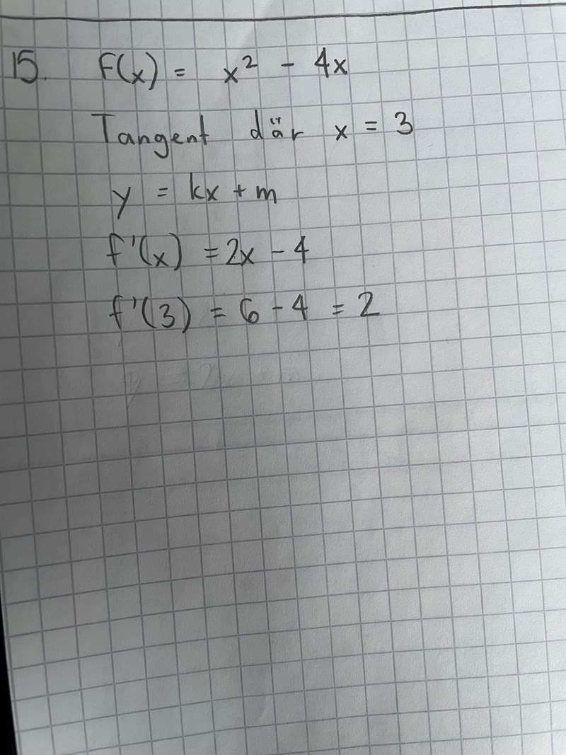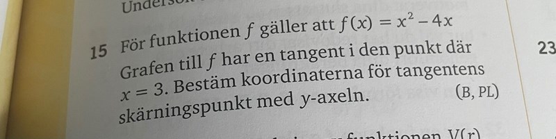 Börja med att derivera funktionen och beräkna f'(3). Vad är det du har beräknat då?