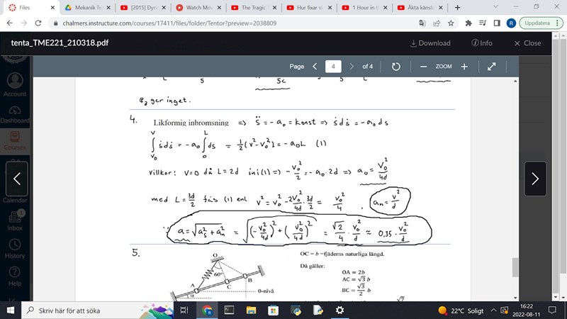 Nu hade jag inga problem med de första delarna i att lösa uppgiften, men när jag skulle lösa den totala accelerationen tog det stop i mitt huvud. Jag har ringat in delarna i lösningsförslaget som jag inte alls förstår: